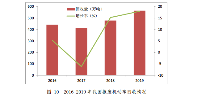 截至2019年底,我國報廢機動車回收拆解企業共755家,回收網點約2271個,從業人員約2.4萬人。2019年,機動車回收數量為229.5萬輛,同比增長15.3%,其中汽車195.1萬輛,同比增長16.8%;摩托車34.4萬輛,同比增長7.1%。按照車輛類型分,客車回收量為138.7萬輛,同比增長17.1%;貨車45.3萬輛,同比增長18.9%;掛車5.5萬輛,同比增長29.3%;專項作業車2.8萬輛,同比下降1.4%。2016-2019年我國報廢機動車回收情況如圖10所示。