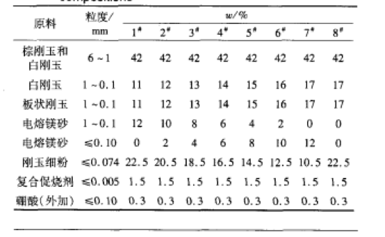 以棕剛玉、白剛玉、板狀剛玉、鎂砂為原料,研制的中頻爐用鋁鎂質干式搗打料,其最佳配比(W)為:6—0.1mm的顆粒料76%0,≤0.1mm的細粉料22%,≤0.005mm的復合高溫促燒劑2%,≤0.1的硼酸0.3%(外加)。