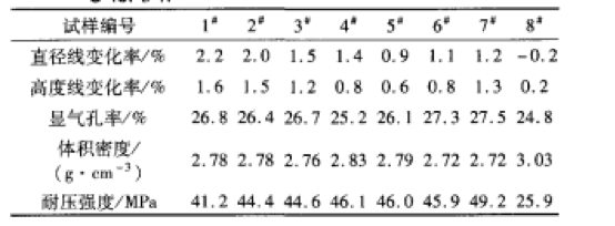 將所有試樣分別在1000、1200、1350和1600cI=熱處理3h后,觀察其燒結情況,同時將經l350oC3h燒后的試樣4A一_4F再經1600oC3h熱處理。對1600℃3h燒后的各試樣進行直徑線變化率和高度線變化率(GB/T3997.1一l998)、體積密度(GB/T2997-2000)以及耐壓強度(GB/T5072-2008)檢測,同時并對現場使用后的干式搗打料殘襯進行顯微結構觀察。