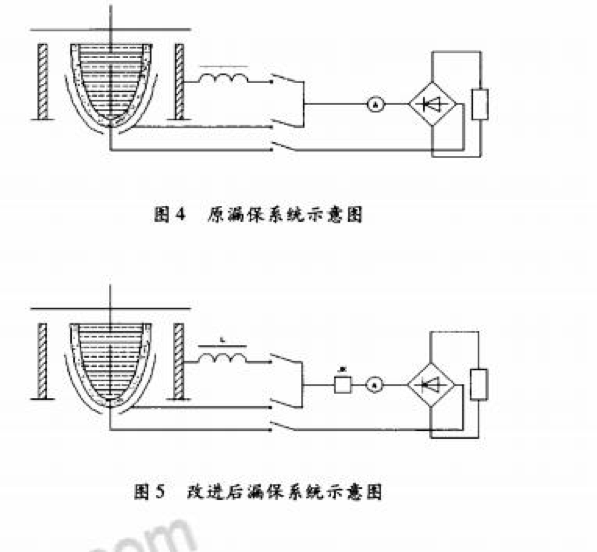 為解決上述出現(xiàn)的問題,須對(duì)漏保系統(tǒng)進(jìn)行改動(dòng),原系統(tǒng)示意如圖4所示,改動(dòng)后的系統(tǒng)如圖5。對(duì)改動(dòng)后的漏保系統(tǒng)又進(jìn)行了操作補(bǔ)充說明及要求:①漏保系統(tǒng)在烘爐狀態(tài)不投入運(yùn)行;②漏保系統(tǒng)在投入棚料狀態(tài)不投入運(yùn)行;③漏保系統(tǒng)在爐內(nèi)熔液處于熔融狀態(tài)時(shí)不投入使用;④經(jīng)常觀察控制柜上的功率表、功率因數(shù)表、電流、電壓表、頻率表記錄其變化;⑤中頻爐漏保系統(tǒng)在爐料熔融狀態(tài)下適時(shí)監(jiān)測(cè)。經(jīng)過以上改進(jìn)措施,大大提高了爐齡的使用壽命,避免了中頻電爐壓爐板與爐內(nèi)爐料接觸及漏磁急劇變化引起的誤報(bào)警動(dòng)作,保證了中頻感應(yīng)電爐運(yùn)行的可靠性。