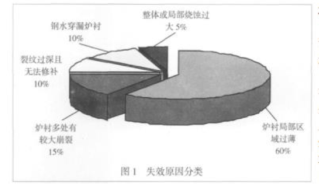 柳工機械股份有限公司鑄鋼廠每年熔煉鑄鋼鋼 液約 16000t,使用 6t 中頻爐和 3t 電弧爐熔煉碳鋼。長期以來中頻爐使用一家知名的爐襯材 料供應商提供的爐襯材料,但一直存在著中頻電爐爐襯壽命 偏短的問題,平均爐襯壽命約 45 爐。爐襯壽命偏短 導致頻繁的修筑爐襯和烘爐,對生產組織和成本控 制都帶來了很不利的影響。為了解決這個問題,從 2008 年 6 月開始,我們開始在延長爐襯壽命方面進 行探索。我們首先進行了中頻爐煉鋼爐襯的失效原 因分析。 根據對 2008 年全年筑爐 25 次的失效統計,目 前的中頻電爐爐襯材料最主要缺點是裂紋傾向大,爐襯容易 因裂紋而導致多處崩裂、造成局部區域過薄而失效; 其次是中頻電爐爐襯下部燒蝕過快導致爐襯失效。失效原因 分類見圖 1。
